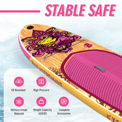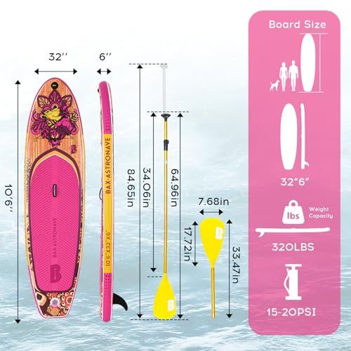 🏄 Upgraded inflatable paddle board measures 10’6″ x 30″ x 6″ weighing 17.5 lbs, with a capacity 230 lbs. Even beginners will find it easy to use. The EVA deck is textured with grooves for superior slip resistance and a comfortable foot grip.
