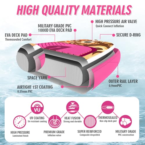 🏄 High-quality military-grade ultra-light PVC material and advanced needle-drop core tech ensure that the inflatable boards have higher compression resistance and elasticity. The EVA deck is textured with grooves for superior slip resistance and a comfortable foot grip.