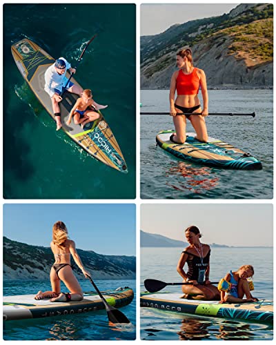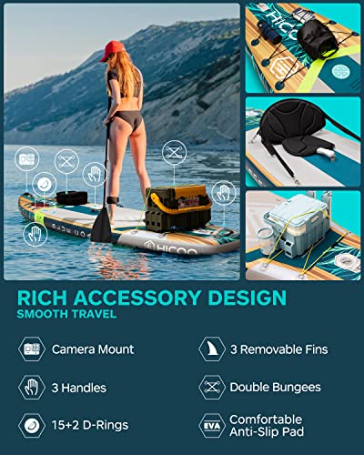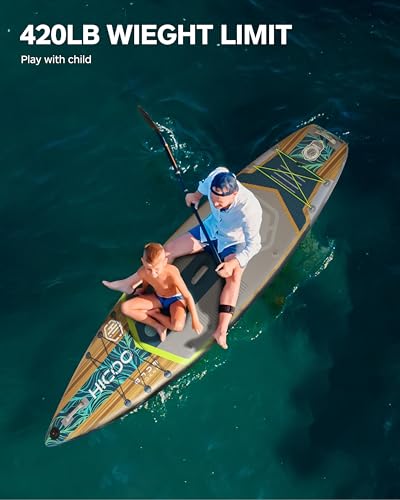 【420LB WEIGHT LIMIT】The 420lb weight capacity of HICOO paddle board means you can enjoy it with family and friends, carry additional gear such as tents, food, and water, and cater to a wider range of activities such as fishing, playing, yoga, and more. This feature provides greater flexibility and versatility for a more enjoyable and personalized water experience.