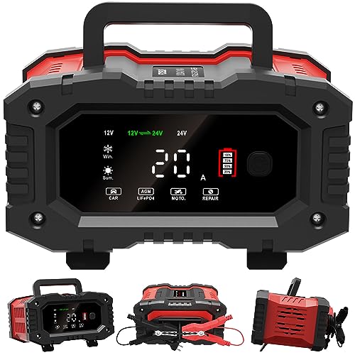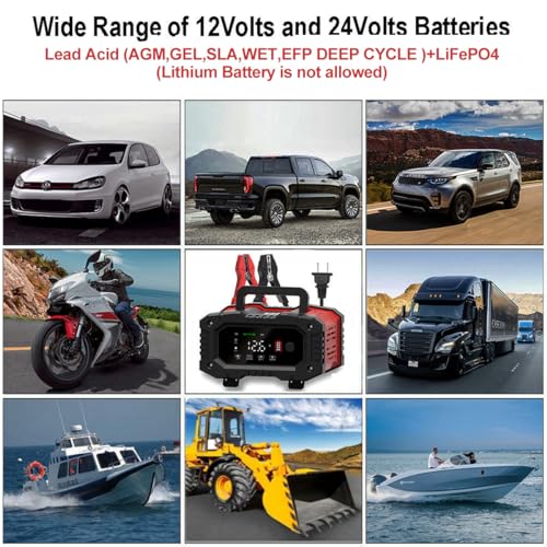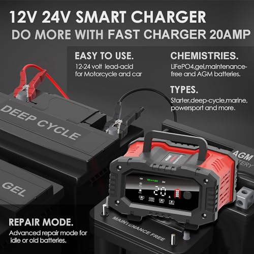 ✅【Upgraded 20-Amp Quick Battery Charger】The NEW version intelligent battery tender, the charging speed is 12V@ 20Amp and 24V@ 10Amp, which is much faster than 10A or 6A automatic chargers. Designed to charge, maintain and repair all 12-volt and 24-volt lead-acid automotive, LiFePO4, marine and deep-cycle batteries including AGM,GEL,EFB,SLA,Flooded(WET),Calcium in cars, truck, SUVs, ATV, motorcycle, snowmobile, lawn mower, boat, tractor, forklift, golf cart, etc.NOTE: LITHIUM BATTERY DISABLED.