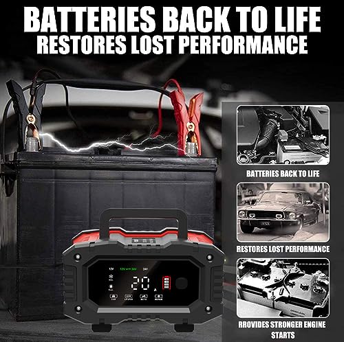 ✅【3-in-1 Quick Battery Charger, Maintainer and Desulfurizer】Works as 12V or 24V battery charger, this 12V/20A and 24V/10A fully-automatic smart charger is powerful to solve various battery problems. It’s the all-in-one solution battery charger, battery maintenance charger, trickle charger, plus battery desulfator. Automatically battery test, charge and maintain your loss battery for stronger engine starts and extend battery life.➤It is not a jump starter, only the battery charging function.