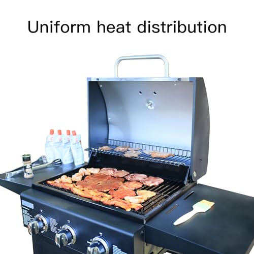 【Uniform heat】 Gas grill outdoor is designed with 3 stainless steel burners, which is played by 30,000 BTUs per hour, and the heating is fast and uniform. You can quickly cook your burgers and salmon slices.