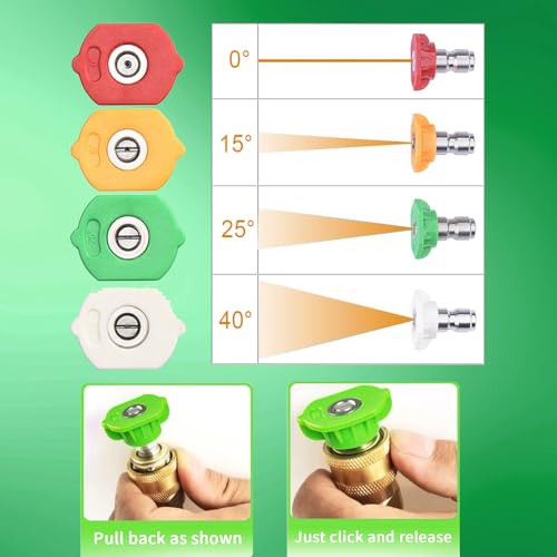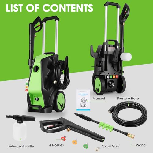 【Premium Accessories Included】 Unbox and conquer effortlessly! Our portable pressure washer comes with top-of-the-line accessories including a 20-foot rubber hose, 4 QC nozzles for various cleaning needs, a 500ml foam cannon, metal lance, gun, and a 35-foot electric cord with GFCI. The spray gun has a 𝟏/𝟒” metal connection suitable for various extensions like surface cleaners and turbos.
