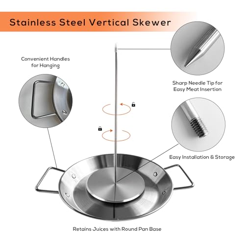 Fengzhe Al Pastor Skewer for Grill:Stainless Steel Vertical Stand, Brazilian Spit Stand with removable 3 Spikes, 2 Brushes, Anti-scalding Fittings, Fat Separator Tray, for Tacos Al Pastor, BBQ