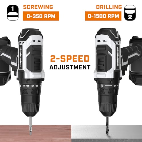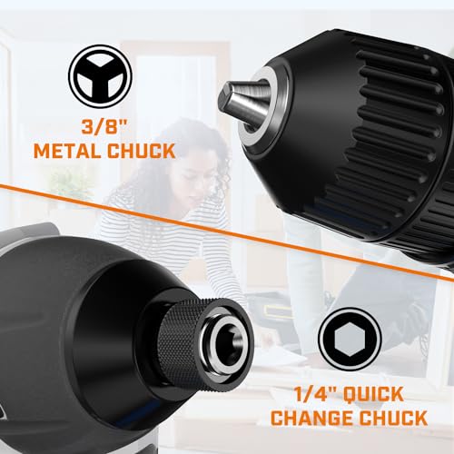 3/8-Inch Cordless Drill Kit:Features a 2-speed transmission (0-700 RPM / 0-1500 RPM) for high-speed drilling and low-speed screwdriving flexibility;a 64+1 position clutch for quick torque adjustments,and a 3/8-inch keyless chuck for fast and easy bit changes,enhancing your work efficiency.