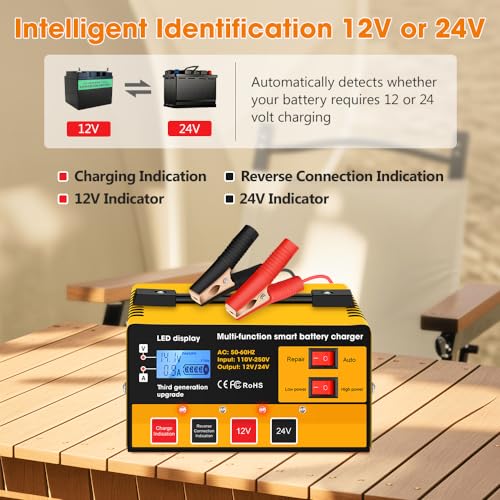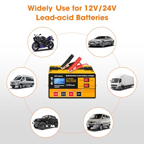 【FAST CHARGING】The charger is designed for 12V/24V batteries. Input voltage: 100-240V AC, Battery range:12V/10AMH(max); 24V/7.5AMH(max). Automatically adjust the charging current, easy to deal with a variety of harsh voltage environments, quickly charge the battery. Suitable for charging any lead acid, Flooded(WET), GEL, Calcium type deep cycle, maintenance free and AGM batteries with capacities up to 6-105Ah (Amp-hours).