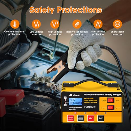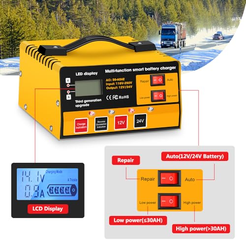 【INTELLIGENT LCD DISPLAY】The automatic intelligent charger can display current and voltage without manual adjustment, making it easier to charge your battery. Automatic mode of battery charger: fully intelligent charging and maintenance of battery, no extra operation required. Manual mode: adjust the charging mode, for example, you can continue charging after the automatic mode is charged.
