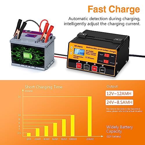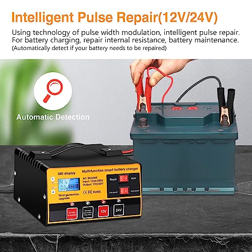 🔋 【 Multi-Function Battery Charger】Diagnose and repair various battery problems, including flooded or sealed maintenance free batteries. Pulse repair function can help to repair your loss battery and extend battery life. Compatible with all 12Volt & 24Volt lead-acid automotive, marine, deep-cycle batteries: flooded, gel, AGM, maintenance-free, WET, CAL, EFB on automotive vehicles, motorcycle, marine, RV, Powersport, lawn&garden, small truck, scooter, etc.