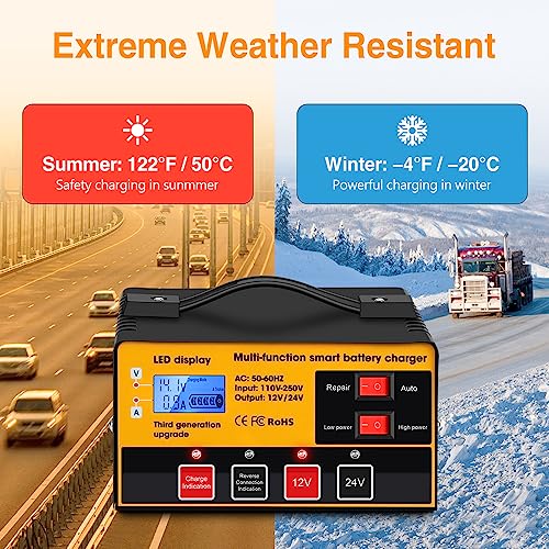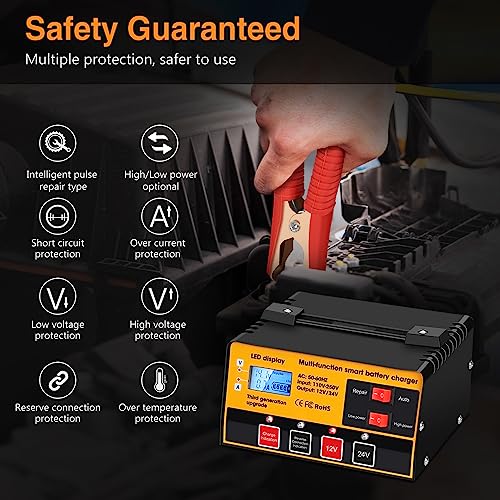 🔋 【Four Charging Modes 】① Auto mode:regular use. Automatic detection of 12V/24V batteries and automatically stopping when fully charged. ② Repair mode: used for repairing for vulcanization or recharging in a low-temperature environment.(Used when activating batteries with long loss points or high internal resistance.) ③ High Power: used for charging large and medium-sized batteries (battery capacity of 30ah or above).④ low Power: used for charging small batteries (battery capacity below 30ah ).