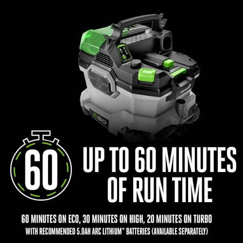 The EGO POWER+ 9 Gallon Wet/Dry Vacuum is the industry’s most powerful cordless wet/dry vac with a brushless motor that delivers 110CFM of powerful suction for 100-inch lift. Plentiful onboard storage conveniently stows nozzles, extensions, and hose for easy organization of your shop vac accessories. A filter cleaning function keeps the filter clean for maximum suction and efficiency when filling its 9-gallon tank. This cordless shop vac features multiple power modes including Low, High, and Turbo, which can be controlled onboard or via an included wireless remote. It runs up to 60 minutes on ECO, 30 minutes on high, or 20 minutes on turbo with the recommended 56V 5.0Ah ARC Lithium™ battery (available separately). It includes two extension tubes, a crevice nozzle, round brush dust nozzle, large floor nozzle and brush bar, rubber bar, compact floor nozzle, and a 1-7/8-inch hose. Clean with Power Beyond Belief™ with the POWER+ 9 Gallon Wet/Dry Vacuum Cleaner.