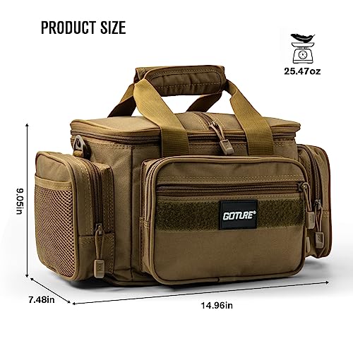 【Perfect Size】Size:14.96”x9.05”x7.48”.With its generous main compartment, this fishing tackle bag can accommodate up to 3 size 10.8*7.25*1.65in tackle boxes(not included, but available one after the other from Goture), providing you with a lot of space for your entire essential fishing gear. Additionally, it features six external storage pockets, making an allowance for organized storage and easy access to your fishing accessories.