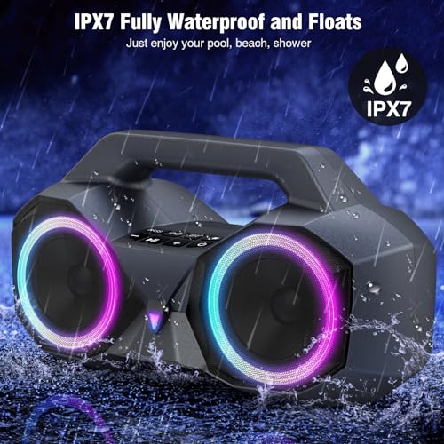 Fully IPX7 Waterproof: The Waterproof Bluetooth speaker is against rain, spills, and splashes and can even continue to exist submersion in up to 3.3 feet of water for up to 30 minutes. Perfect for the use of in-house parties or taking to pool parties, beach parties, barbecues, hiking, camping, etc.
