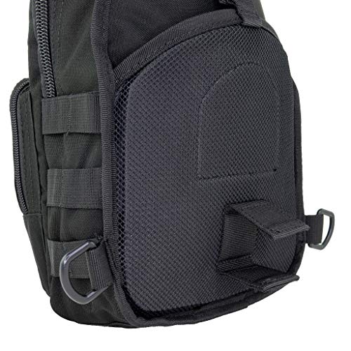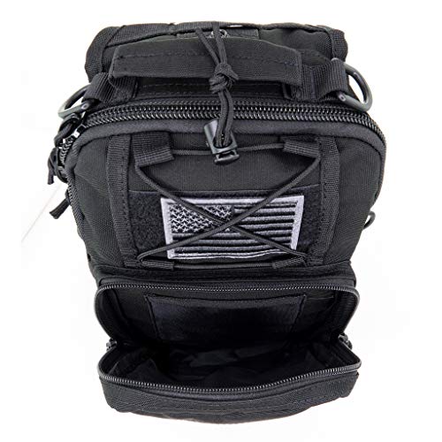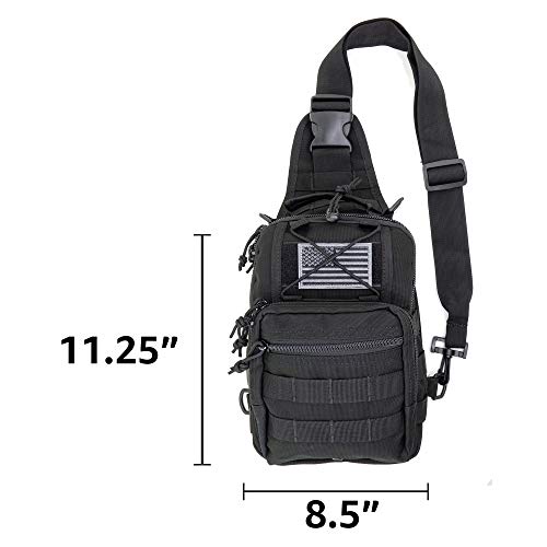 MULTI COMPARTMENTS: This tactical sling bag has 5 double zippered compartments, 3 zippered compartments 2 drainage grommets. Multi interior pockets of all sizes and styles make it ideal for an day out bag with USA Flag patch, 2 ¾” x 3 ¼”, interchangeable.