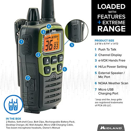 Midland – T77VP5J Jeep® X-TALKER Extreme Dual Pack – 22 Channels, 121 Privacy Codes, Water Resistant – Clear Communication with Weather Alert – Jeep® Branded Carrying Case & Headset Included