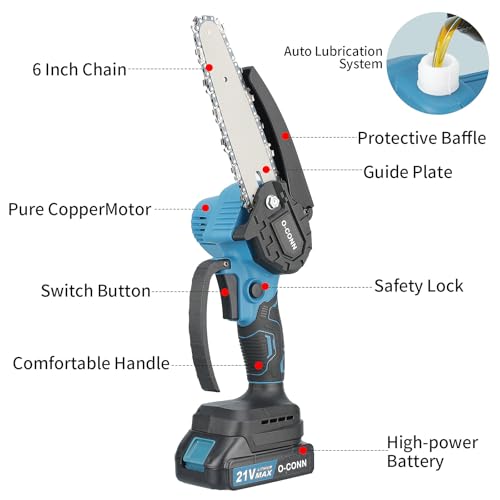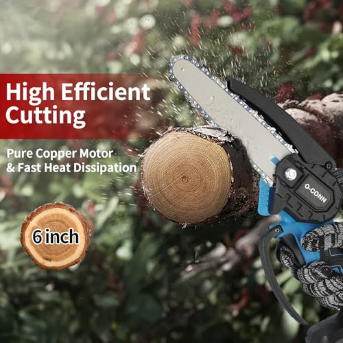 O-CONN Mini Chainsaw Cordless 6 Inch Handheld Chain Saw with Security Lock & Auto Oiler System, Portable Electric Small Chainsaw for Tree Branches, Courtyard, Household & Garden