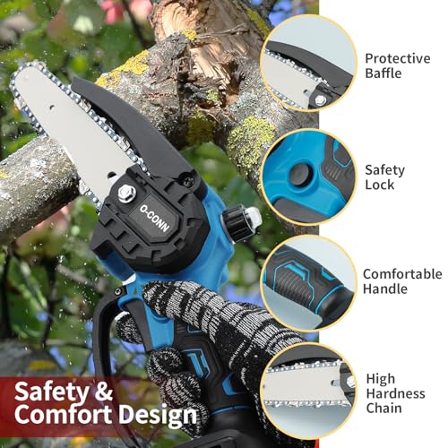 High Efficient Cutting: O-CONN mini chainsaw uses a more powerful pure copper motor and 21V MAX 2000mAh high power battery. Deep quenched and hardened 6-inch integrated guide plate and chain have high wear resistance and durability. With fast heat dissipation, cutting efficiency is higher.