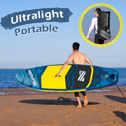 【 Excellent Stability and Handling】—Three detachable bottom fins help improve overall speed and handling.Inflatable stand up paddle board can be used in exploring,touring,fishing,yoga.Also suitable in the ocean,fresh water lakes,and rivers.】—SUP board are made of premium PVC & highest military grade material. This reinforced lightweight fabric creates a stiff, rigid and sturdy blow up sup board durable for years. Soft anti-slip EVA top deck improves comfort and safety while standing.