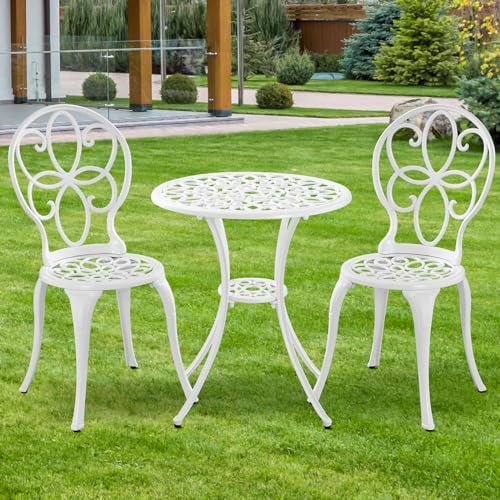Withniture Patio Bistro Sets, Cast Aluminum Bistro Table and Chairs Set of 2 with Umbrella Hole, Bistro Set 3 Piece Outdoor, Metal Patio Furniture Set for Garden Porch, White
