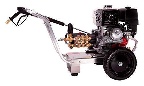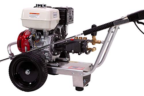 Pressure Pro E4040HG Professional 4000 PSI Gas Pressure Washer has revolutionary aircraft grade aluminum frame with dual handles. It has a Honda GX390 engine and can push 4 gallons per minute. The 50 mesh inlet filter protects the engine from any unwanted dirt and has an easy to adjust pressure unloader and a low oil indicator shut down. The pneumatic tires are great for any surface with dual padded shock absorbing feet. The commercial grade engines provide long lasting run time and includes a thermo sensor to prevent overheating the unit.