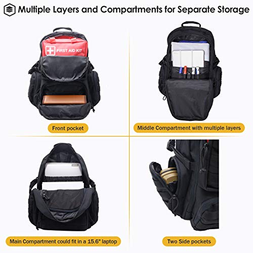 【Multiple Compartments】Designed with 6 compartments for storing different stuff: One main compartment is large enough for laptop or hydration bladder with built-in pocket and zippered mesh pocket, plus a hidden top hole to feed the tubing; One medium-size compartment with built-in pockets and multiple slots for sorting; Two front compartments for personal stuff; Two side compartments for bottle, clip, ammo, etc.