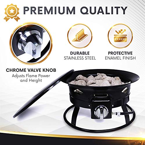 COMPLETE FIRE PIT KIT: Included in the box a 1 Pre-Attached 10 Foot Hose to keep your 20LB Propane tank safely out of sight. 1 Set 4.5 LB Natural Lava Rock Set designed to enhance flickering effect. 1 Gas cylinder Holder to make the gas cylinder more stable. 1 Steel cover and 1 Carry Kit. Fully Adjustable regulator with chrome valve knob for varying flame height.