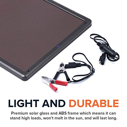 All-Weather Resistant- Our solar trickle charger has a portable 7.5W high efficiency, weatherproof, amorphous solar panel, which means your battery keeps charging under the sun or in cloudy conditions and other inclimate weather!