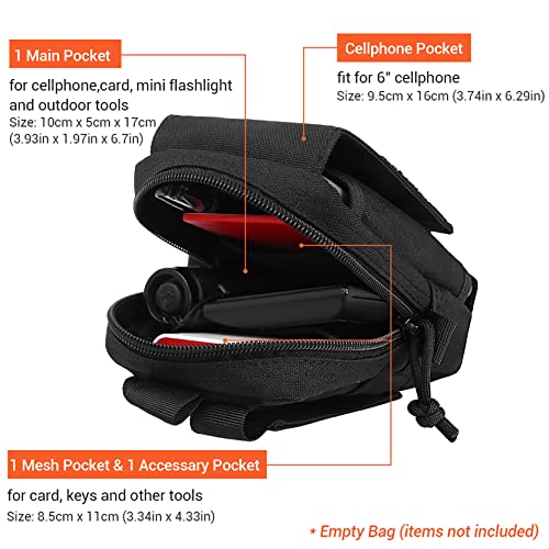 Double Zipper A couple of Pockets: EDC Utility Pouch has one main zipper pocket, inner compartment, and mesh pocket, allowing you storage small gadgets. Such as mobile phone, mobile power supply, card, pen, pliers, mini flashlight, screwdriver. Some other magic sticker closure phone pocket may also be easily put into your cell phone.