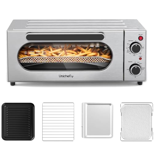 Unichefry Toaster Oven Air Fryer Combo with 4 Accessories, 1800W Countertop Convection Toster Oven Fits 9 Slices toaster or 12″ Pizza, Stainless Steel with 4 Functions :air fry, toast, Bake & Broil