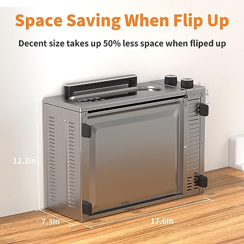 16QT Medium Capacity and Space Saver — The 15L dual layer Toaster Oven Air Fryer Combo is the compact size which can holding up to 9 slices bread, 12″ pizza, 15 chicken wings, 12 egg tarts, and 9 bagels, etc. The package including basket/rack/bake tray perfectly accommodate various food raw material like raw french fries, cold meat, fresh fish to enhance the cooking flexibility and convenience. It only takes up 50% less space when you flip it up and stay standby against your kitchen backsplash.
