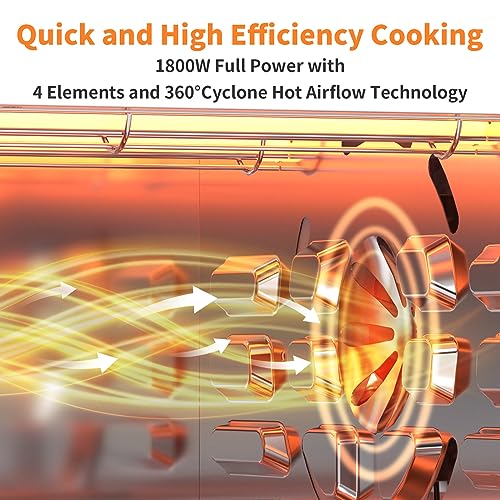 Powerful and Even Cooking — Equipped with 1800W non-oversized power and 4 heating elements structuring in upper and lower ,The Toaster Oven Air Fryer Combo cooks and heats up to 50% faster than a traditional oven, The outstanding 9 slice bread TOAST function enables it to prepare a quick breakfast to whole family in less than 4 minutes with LIGHT/MED/DARK level selection. Besides, The 360 degree airfry mode with visual fans can produce less oil & crisper fries to maintain your healthy lifestyle.