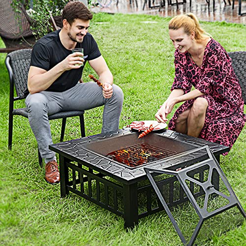 VIVOHOME 32 Inch Heavy Duty 3 in 1 Metal Square Patio Firepit Table BBQ Garden Stove with Spark Screen Cover Log Grate and Poker for Outside Wood Burning and Drink Cooling Black