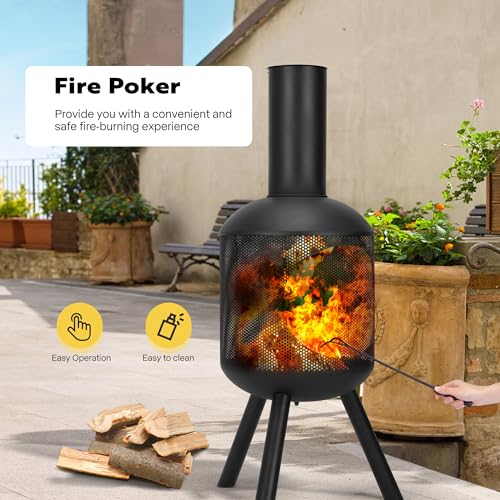 EASY OPERATION – The open fire pit design allows for easy handling of firewood, while the 6-inch round opening facilitates effortless ignition of the fire and removal of ash and debris; Additionally, the fire pit comes with a fire poker to assist in moving the burning material, ensuring a more convenient and safe fire-burning experience