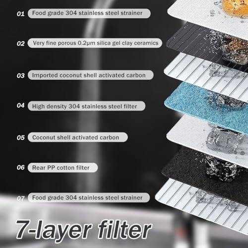 【7-LAYER FILTER】Adopts a thickened natural ceramic composite filter, which is washable. The seven-layer filtration system design can effectively filter sediment, rust, dirt, impurities.